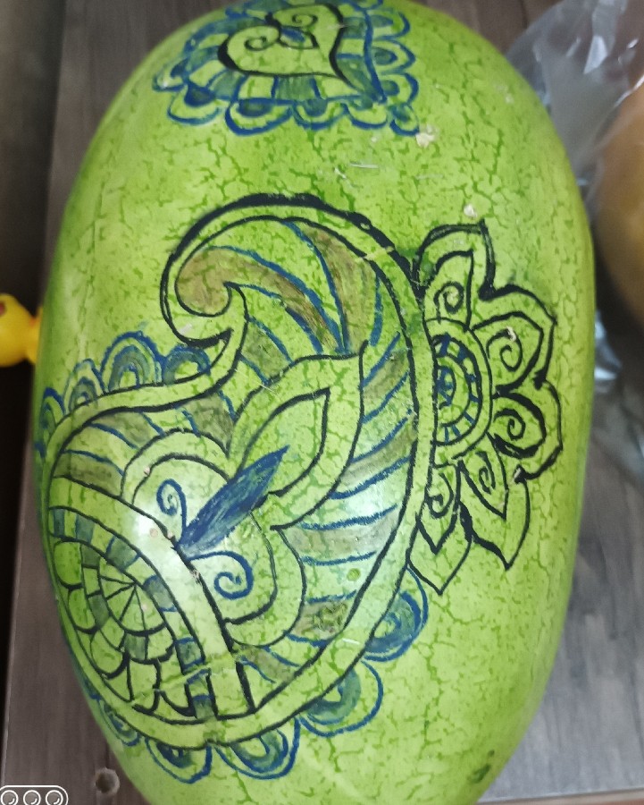 البته من این طرحها رو با مداد چشم انجام دادم🤭ولی شما باهر چیز دیگه ای که رو ی هندوانه وکدو رنگش بیفته میتونید این کار رو انجام بدید.