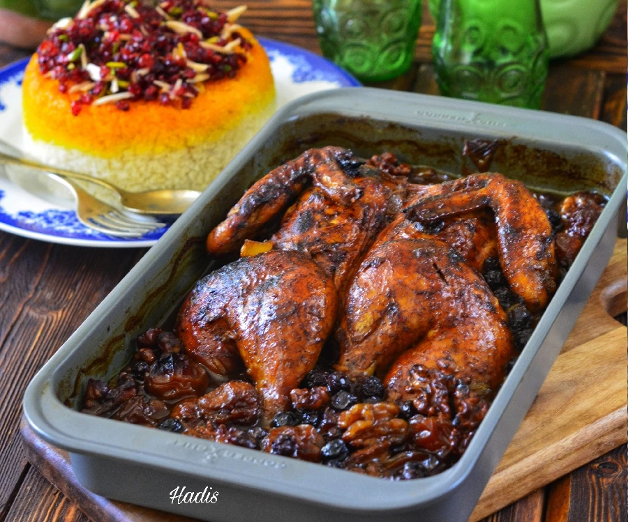 زعفران دم کرده روی مرغ بریزید و ماساژ بدید روغن بریزید و بعد رب ازگیل اطراف مرغ رو با آلو بخارا گردو و آلبالو خشکه پر کنید و بعد سس انار رو با قوام نارنج مخلوط بکنید کاملاً هم بزنید تا یکدست بشه و روی مرغ بریزید اگر قوام نارنج نداشتید از آب نارنج تازه یا آب لیمو ترش تازه استفاده کنید